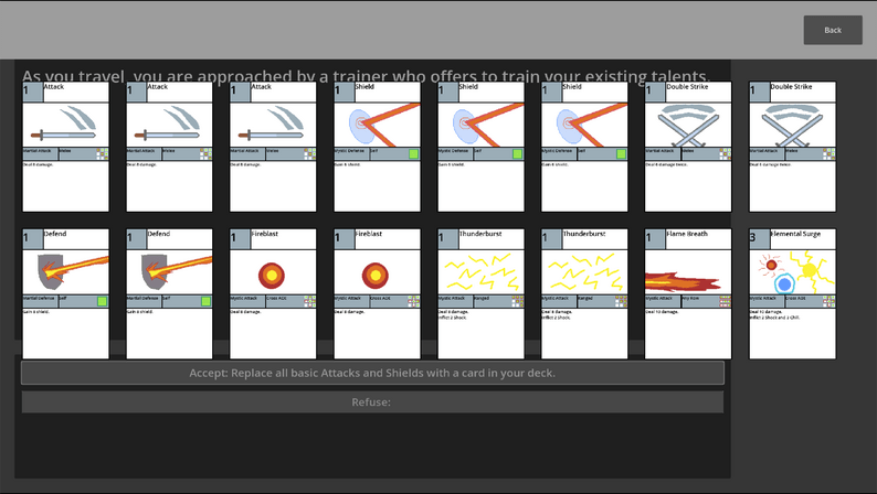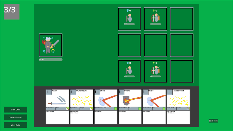 I made Mage Knight in order to explore a novel concept for roguelike deckbuilders. The goal was to expand on common deckbuilder mechanics by allowing players to pick two classes from which to pull cards – one martial class and one mystic class. This design would allow players to mix-and-match different types of synergies from their classes in order to allow for increased variability between runs.